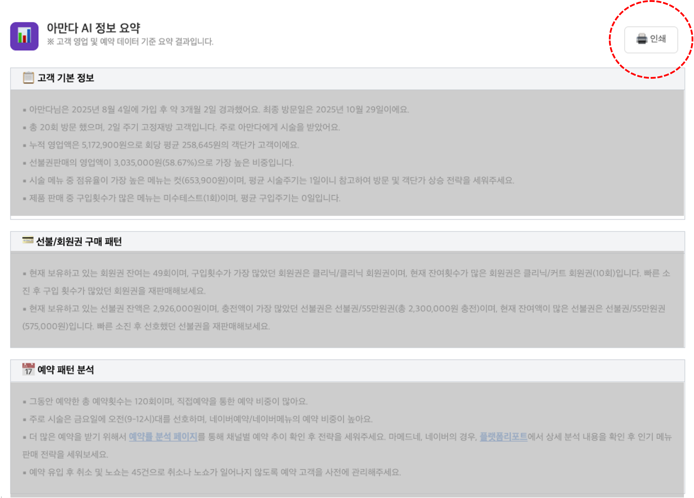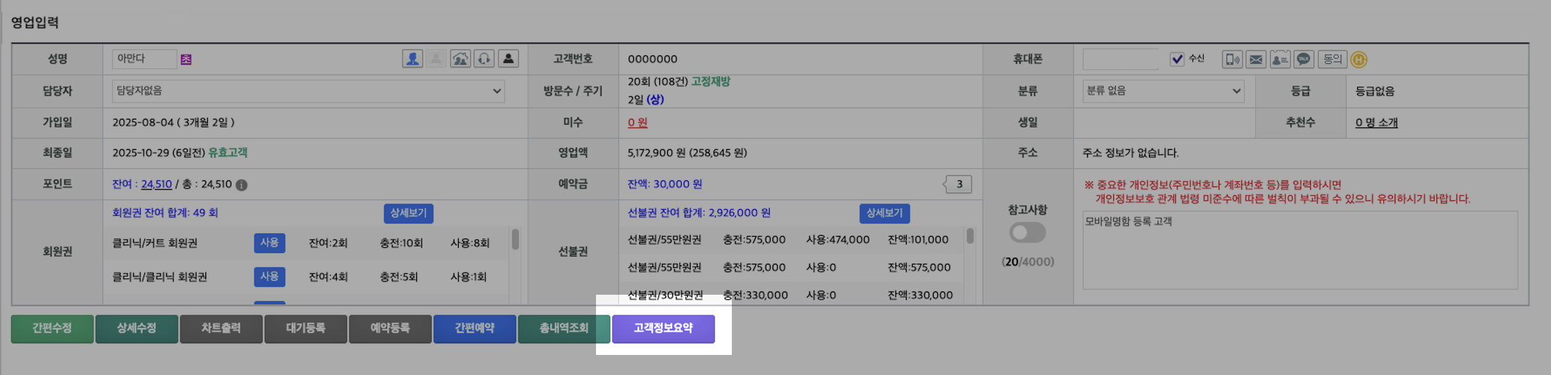 고객 방문 시 [고객정보요약] 버튼을 눌러 요약된 고객 정보를 확인하고, 고객별 맞춤 접객 전략을 세워보세요.