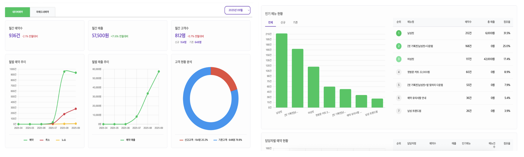 월간 예약, 매출, 고객수의 전월 대비 추이와 신규고객/기존고객 유입 추이, 예약 메뉴 추이, 담당자별 예약 추이 등 상세 분석 데이터를 볼 수 있습니다.