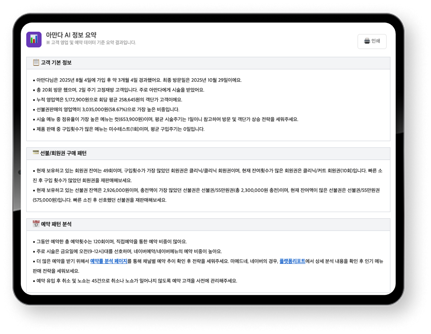 접객 시 고객별 시술 이력, 구매 패턴, 예약 패턴을 AI가 요약하여 바로 확인합니다.