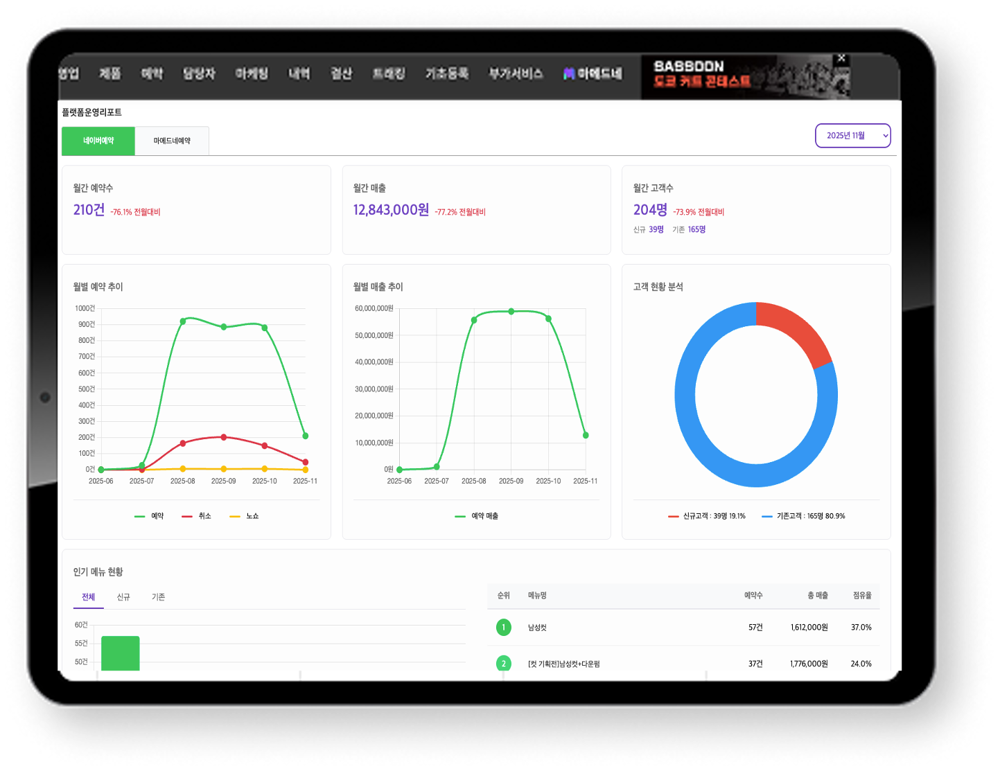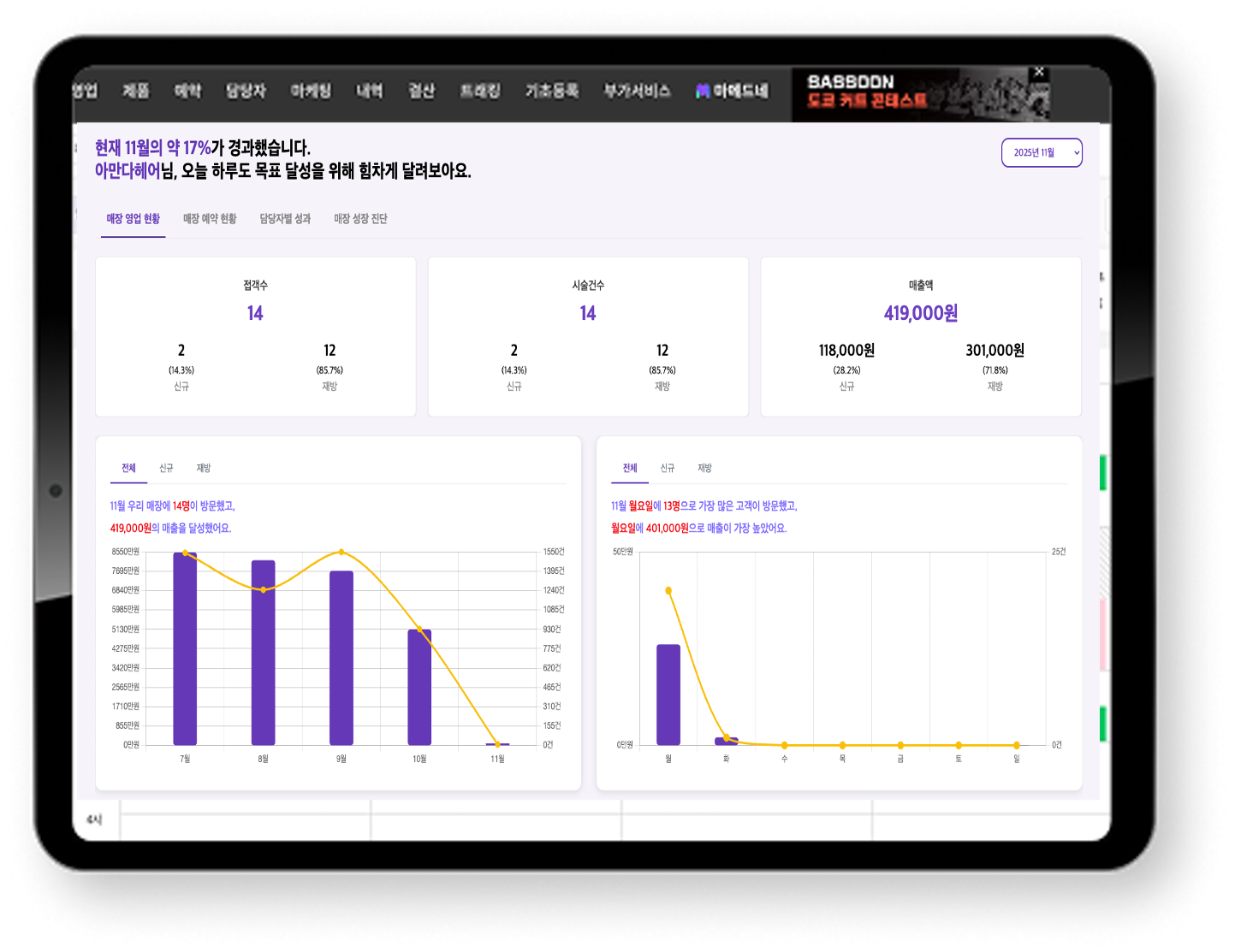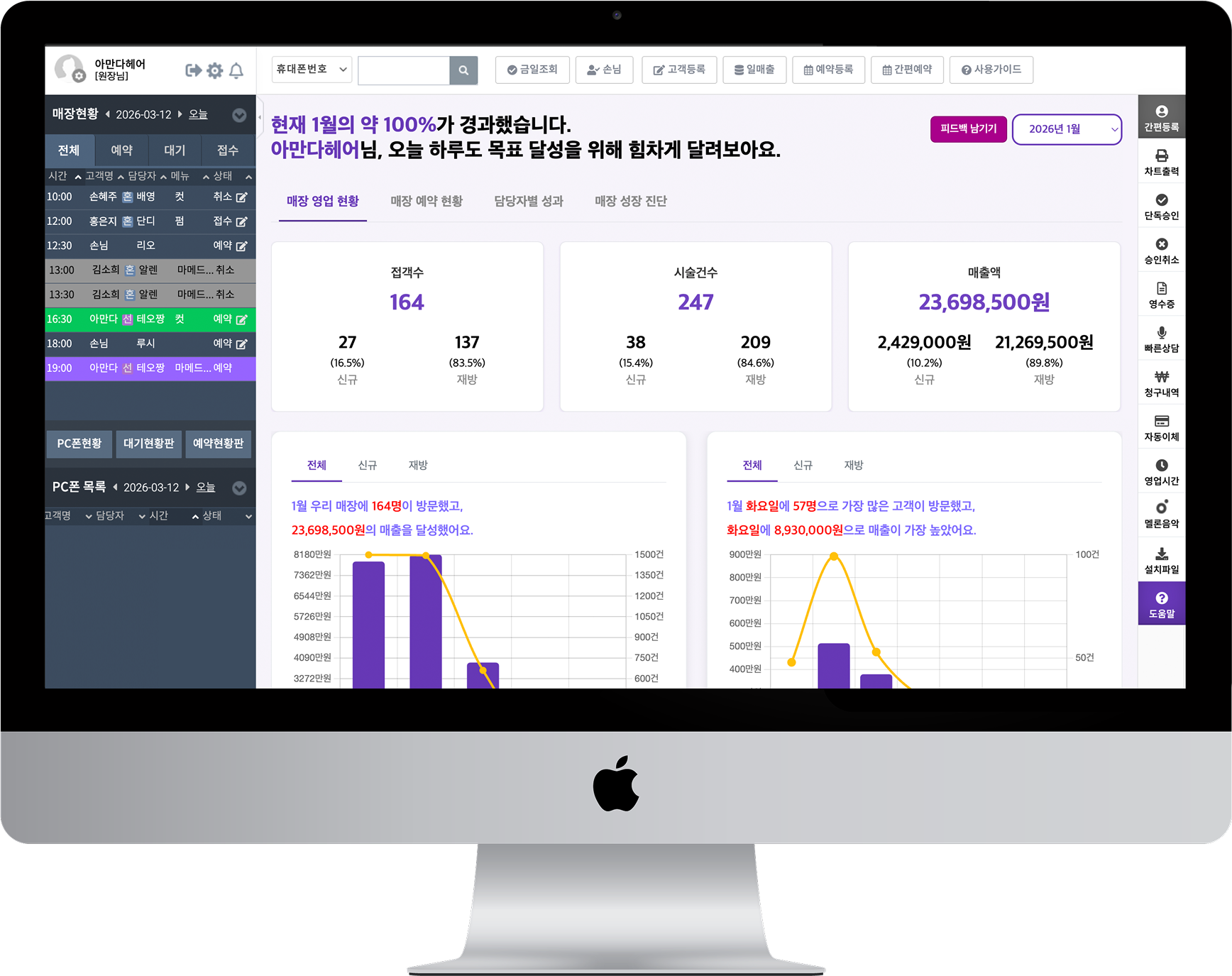 매장 영업·예약 현황부터 담당자별 성과까지, 클릭 한 번으로 전체 현황을 파악합니다.