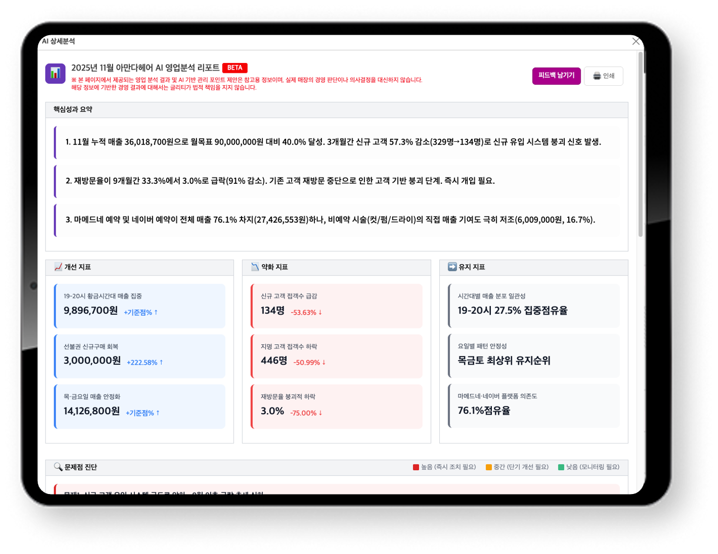 운영 문제점 자동 진단, 맞춤 개선안 제시, 모니터링 포인트까지 AI가 직접 분석해드립니다.
