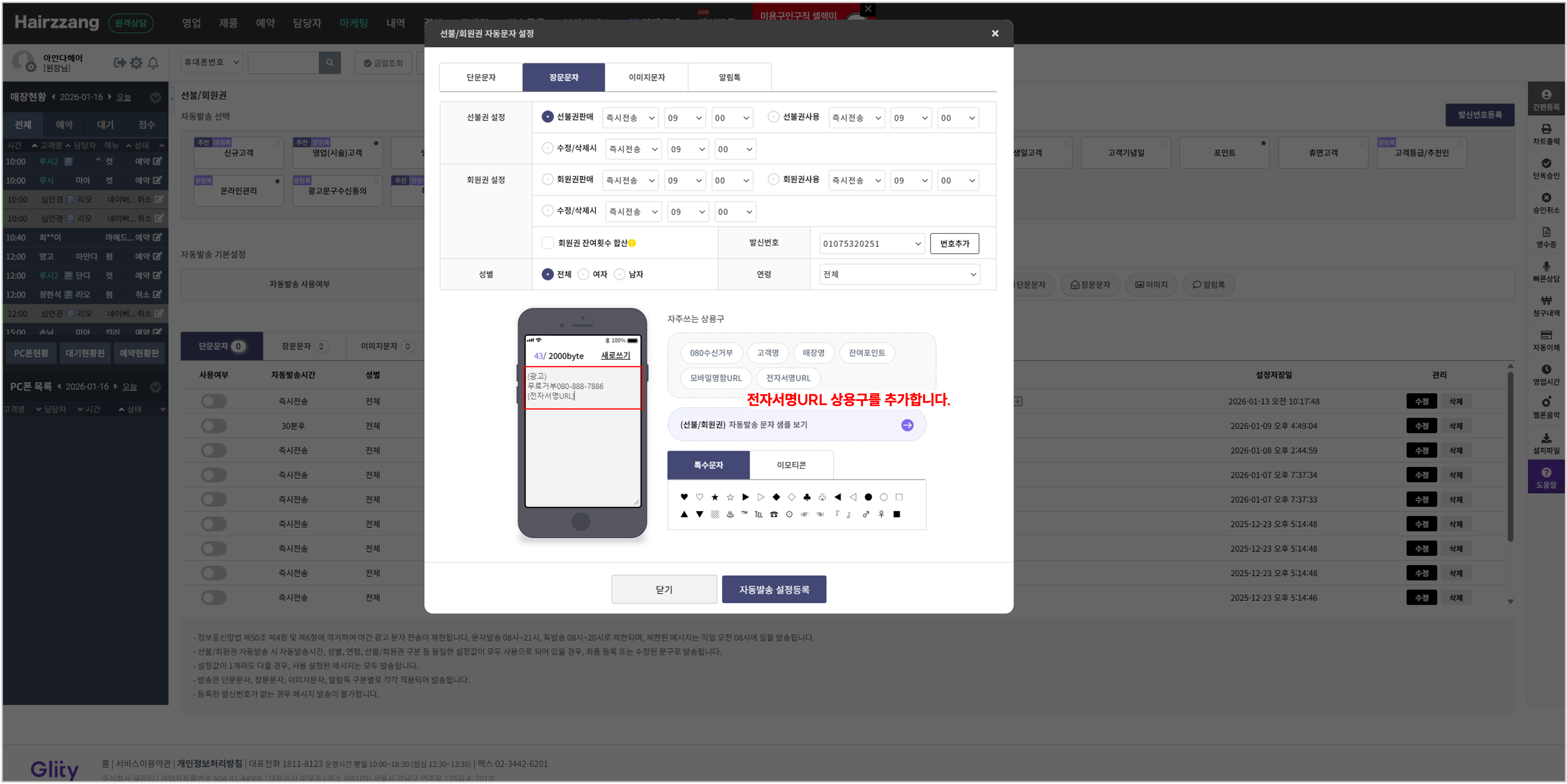- 문자/알림톡 자동발송설정 팝업 내 전자서명 URL 상용구 버튼 추가
